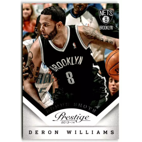 Játékos: Deron WilliamsKiadás éve: 2013-14Gyártó: PaniniSzett: PrestigeKártya szám: #57Változat(parallel): Bonus Shots SilverCsapat: Brooklyn NetsÁllapot: normál, NM-MTBV(Katalógus érték): $2Minden kártyát kártyédő fóliában (bugyiban) küldünk de lejjebb t