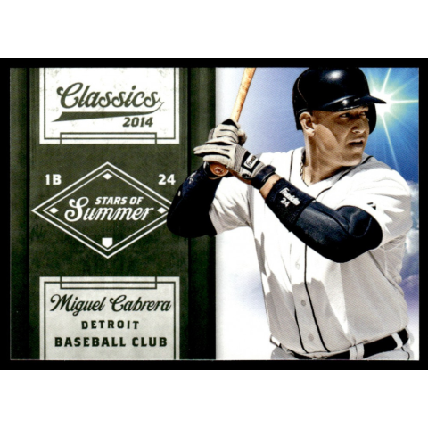 Az eladásra kínált 2014-2015 Panini Classics Stars of Summer #21 Miguel Cabrera baseball kártya NM-MT állapotban van. A baseball kártyákat legtöbb esetben UP Platinum/Standard puha védőtokban és/vagy UP Toploader (kemény védőtok)-ben küldjük. Az elad