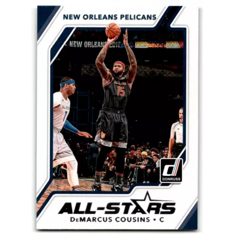 Játékos: DeMarcus CousinsKiadás éve: 2017-18Gyártó: PaniniSzett: DonrussKártya szám: #7Változat(parallel): All-StarsCsapat: New Orleans PelicansÁllapot: normál, NM-MTBV(Katalógus érték): $ Minden kártyát kártyédő fóliában (bugyiban) küldünk de itt fe