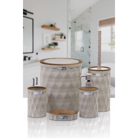 Fürdõszobai szett 5 részes bézs-fa click Diamond OKY-467-3-K - Anyaga: minõségi mûanyag + fa - A szett tartalma és méretei (mm) : - HULLADÉKGYÛJTÕ: Ø 19 cm x 22,3 cm - WC-KEFE: Ø 10,3 cm x 36,5 cm - FOLYÉKONY SZAPPANADAGOLÓ: Ø 8,5 cm x 9 cm x 18,8 cm - FOGKEFE TARTÓ ÉS PASZTA TARTÓ: Ø 8,5 cm x 12 cm - SZÁRAZ SZAPPANADAGOLÓ: 12,5 cm x 9 cm x 2,9 cm - K önnyen használható és helytakarékos készlet kiváló minõségû mûanyagból