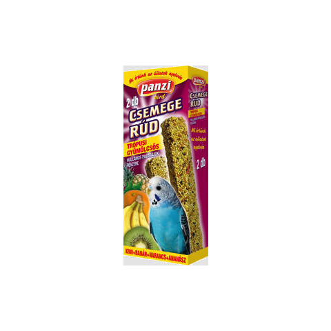 Panzi Trópusi Gyümölcsös Csemege Rúd hullámos papagájok részére (2db)Ízletes csemege kedvencünknek, kalandosan finom ízű táplálék kiegészítő, mely a papagájok eredeti lakóhelyén található gyümölcsök felhasználásával készült.Összetevők: fénymag, fehér köles, muhar, repce, zabAnalitikai összetétel: nedvesség: 9,2%, nyers fehérje: 11,9%, nyers zsír: 5,6%, nyers rost: 8,7%, hamu: 2,3%