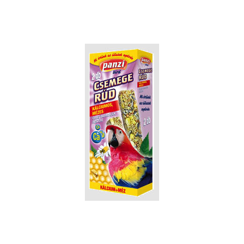 Panzi Kálciumos, Mézes Rúd Óriás papagájok részére (2db)Ízletes csemeg kedvencünknek, kalandosan finom ízű táplálék kiegészítő, mely a papagájok számára fontos természetes összetevőket tartalmaz.Összetevők: búza, kukorica, napraforgó, cirok, sárga köles, zabpehely, búzacsíra, mézAnalitikai összetétel: nedvesség: 9,6%, nyers fehérje: 11%, nyers zsír: 5,1%, nyers rost: 6,8%, hamu: 1,6%