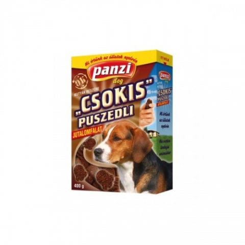 Panzi csokis puszedli jutalomfalat kutyáknak. Ínyenceknek szánt csokoládés finomság a Panzitól. Mancs formájú kekszek, melyekkel bármikor meglepheti kedvencét, aki boldog lesz a falatkák kellemes ízétől.