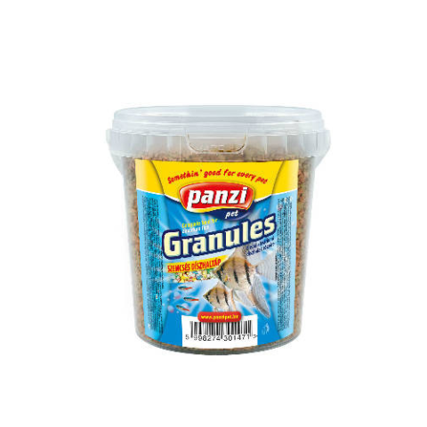 Panzi Szemcsés Díszhaltáp - Az ideális választás a díszhalak egészségének és színének javításához. Magas minőségű összetevőket tartalmaz, amelyek garantálják halaid optimális táplálkozását és vitalitását. Univerzálisan alkalmazható minden díszhal fajnak.