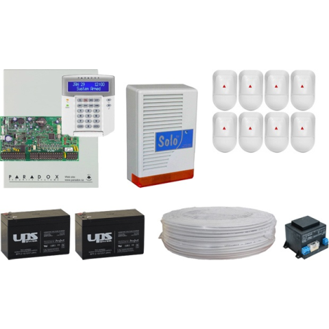 8 infraérzékelős riasztóközpont kültéri szirénával, akkumlátorokkal és LCD kezelővel Ez a rendkívül jó minőségű rendszer kompletten tartalmaz mindent, ami egy megbízható riasztórendszerhez szükséges. Egyedi igények esetén bármikor bővíthető. A riasztórendszer részei 1 db PARADOX Digiplex EVO192 8 zónás riasztóközpont (192-ig bővíthető) 1 db PARADOX Digiplex K641BL+ alfanumerikus LCD kezelő 1 db PARADOX Esprit fémdoboz 8 db PARADOX NV5 Dual passzí