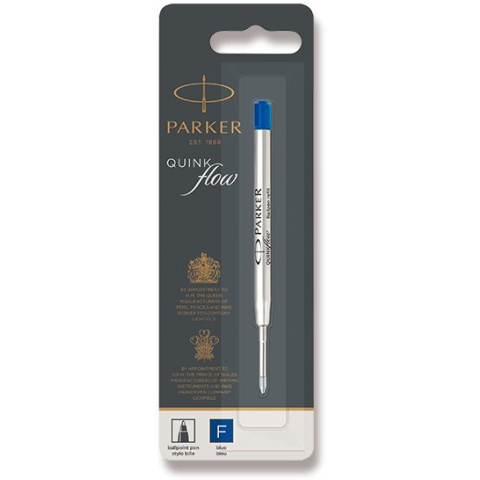 Golyóstoll betét - vonalszélesség 0,8 mm, kék színű Náplň je kompatibilní s kuličkovými pery a propiskami Parker šíře F (0,5 mm). Náhradní náplň v modré barvě Parker Quink flow je krytá víčkem. Klíčové vlastnosti náhradní náplně do k