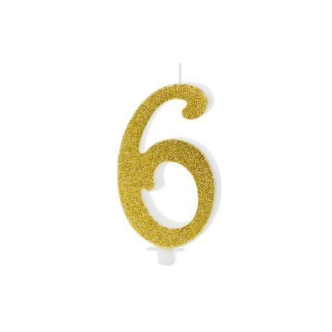 PartyDeco születésnapi glitter gyertya, 6, arany, 10cm Csillogó arany születésnapi gyertya 6 számú, 10cm-es.