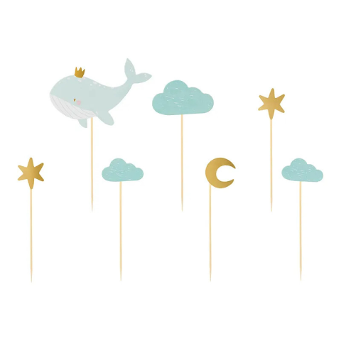 PartyDeco Cupcake tortabeszúró, bálna, 7db Bálnás szülinapi tortadísz tortákhoz. A csomag 7db-ot tartalmaz. Mérete: 11-13.5 cm