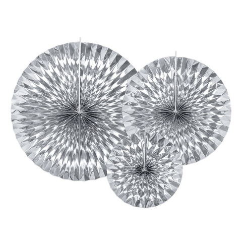 PartyDeco rozetta dekoráció, ezüst, 2db Ezüst tükrös dekoratív rozetták, átmérőjük kb. 40 cm, 32 cm és 23 cm. Egy csomag 3 darabot tartalmaz. Elegáns dekoráció különféle ünnepi alkalmakra.