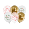 Erős léggömbök Love nyomtatással, a készlet 6 db lufit tartalmaz (2 db pasztell Pure White színben, színes nyomattal, 2 db Crystal Clear rózsaszín nyomattal és 2 db Glossy arany színben), átmérője kb. 30 cm. (1 db / 6 db.)