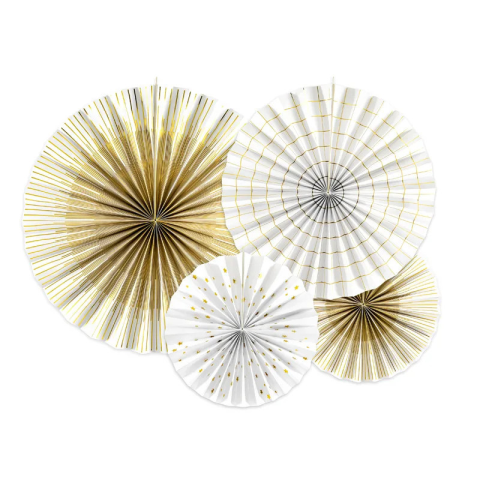 PartyDeco rozetta dekoració, fehér-arany, 4db Fehér-arany 4db-os papír legyezők, melyek kiválóak térbeli vagy oldalfal dekorálásához. A rozetták három különböző méretűek: 2 db 23 cm, 1 db 32 cm, 1 db 40 cm