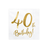 Papírszalvéta 40. Születésnap, fehér, arany felirattal, méret kibontás után kb. 33 x 33 cm, mérete összeszerelés után kb. 16,5 x 16,5 cm. (1 db / 20 db.)