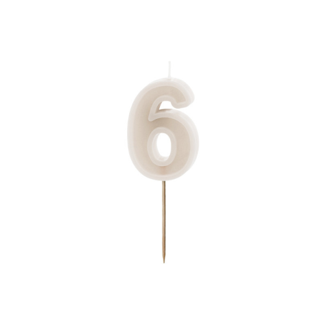 Elegáns homokszínű születésnapi gyertya, amely tökéletes torták és ünnepi sütemények díszítésére. Fa pálcikával együtt kb. 10 cm magas, könnyen rögzíthető. Elegáns homokszínű 6-ös szám alakú születésnapi gyertya, amely tökéletes kiegészítője lehet tort
