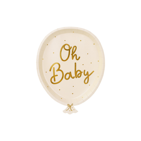 Papírtányérok léggömb alakú, Oh baby felirattal, mérete kb. 17,5 x 22 cm. (1 db / 6 db.)