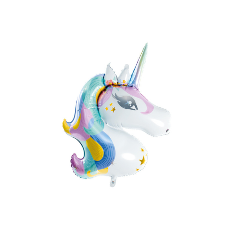 Glossy foil balloon Unicorn in white colour with colorful print, size approx. 73 x 90 cm (28.5 x 35.5'').