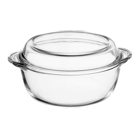 Kerek hőálló tál fedővel. Űrtartalma 1,5 l.
