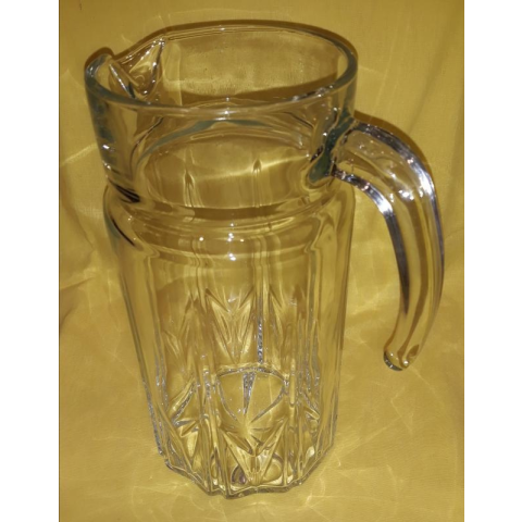 1,5 literes űrtartalmú elegáns üvegkancsó, füllel. Magassága: 23,5 cm, perem átmérője: 11 cm.