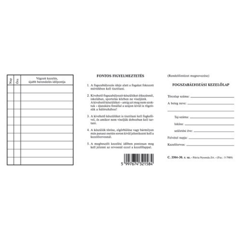 1 kép Pátria Nyomtatvány Fogszabályozási kezelőlap 210x100 mm