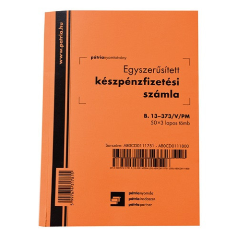 Készpénzfizetési számla 50x3 lapos tömb A/5 álló az egyik leggyakrabban használt nyomtatványtípus; szigorú számadású bizonylat sorfolytonos számozással; áru értékesítésekor, szolgáltatás igénybevételekor a teljesítés igazolására szolgál és alkalmas az