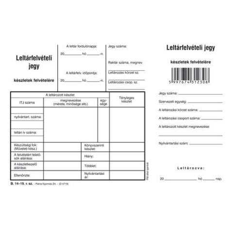 Leltárfelvelvételi jegy készletek felvételére 100 lapos tömb A/5 fekvő - B.14-19 - Nyomtatványok -