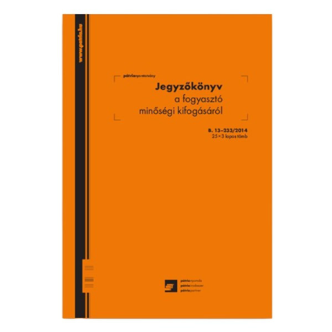 Nyomtatvány jegyzőkönyv a fogyasztó minőségi kifogásról PÁTRIA A/4 25x3 álló Jegyzőkönyv a fogyasztó minőségi kifogásról. PÁTRIA. A/4 méretű, álló formátumú, 25 lapos, 3 példányos. Minőségi belívvel, karton fedlappal rendelkező nyomtatvány. Tartós