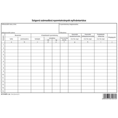 Szigorú számadású nyomtatványok nyilvántartása A/4 fekvő karton - B.15-46/K - Nyomtatványok -