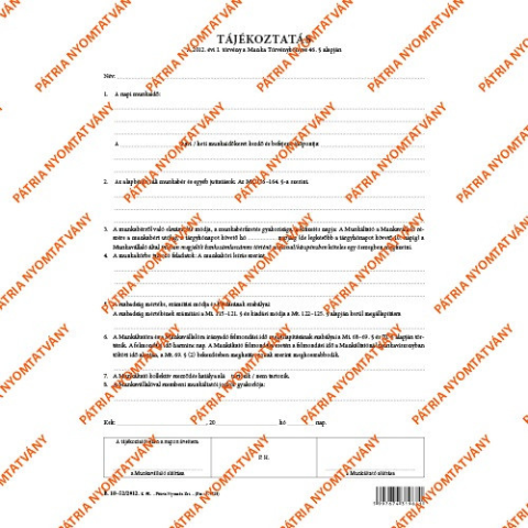 1 kép Pátria Nyomtatvány Tájékoztatás (munkaszerződéshez) 3 lapos garn. A/4 álló