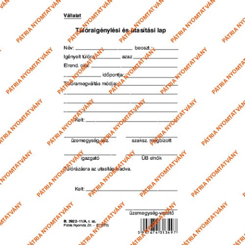 1 kép Pátria Nyomtatvány Túlóraigénylési és utasítási lap 50 lapos tömb 80x140 mm