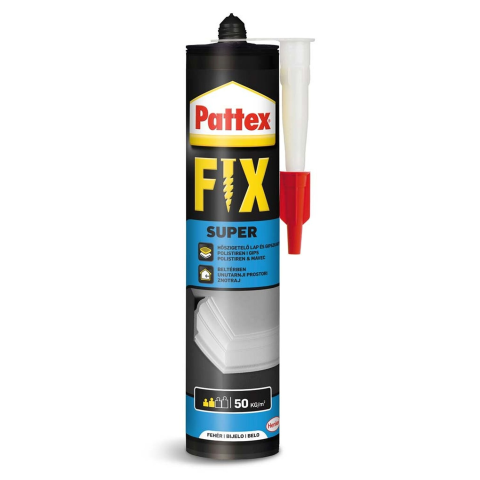 A Pattex Super Fix egy diszperziós erősragasztó, a klasszikus FOLYÉKONY SZÖG®! Fehér színű. Kül- és beltérben helyettesítheti a mechanikus rögzítést. (A ragasztást a tartós nedvességtől óvni kell!) Tubusos és kartusos kiszerelésben is kapható. Alkalmas polisztirol, fa, fém, kerámia tárgyak stb. ragasztására. A ragasztandó felületek egyikének feltétlenül nedvszívónak kell lennie! Hőállóság: -20°C - ᄒ°C. Kötésidő: végszilárdságát kb. 24-48 óra ut
