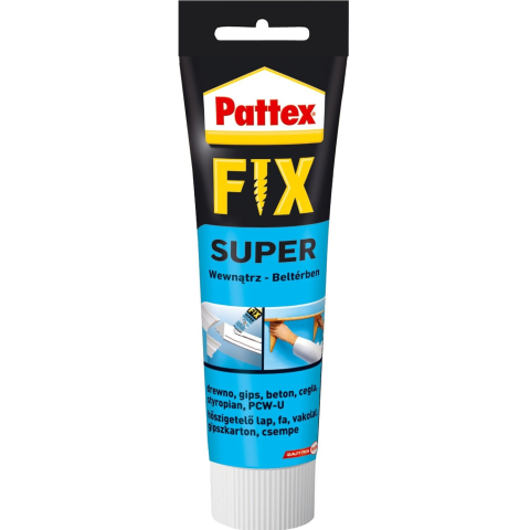 A Pattex Super Fix egy diszperziós erősragasztó, a klasszikus FOLYÉKONY SZÖG®! Fehér színű. Kül- és beltérben helyettesítheti a mechanikus rögzítést. (A ragasztást a tartós nedvességtől óvni kell!) Tubusos és kartusos kiszerelésben is kapható. Alkalmas polisztirol, fa, fém, kerámia tárgyak stb. ragasztására. A ragasztandó felületek egyikének feltétlenül nedvszívónak kell lennie! Hőállóság: -20°C - ᄒ°C. Kötésidő: végszilárdságát kb. 24-48 óra ut