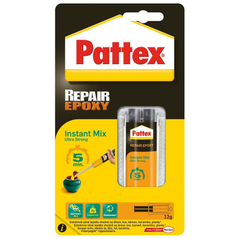 A Pattex Repair Universal keverőszárral egy 5 perc alatt kötő, száradás után átlátszó, kétkomponensű, oldószermentes epoxi ragasztó. Ideális javításhoz, rögzítéshez, ragasztáshoz. Használata könnyű, nincs kézi keverés, nincs kosz. Közvetlenül a felületre kell felvinni. Csaknem valamennyi felülethez jól tapad. Víz- és oldószerálló, átfesthető. Végleges szilárdságát 24 óra után éri el.