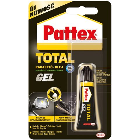 A Pattex Total Gél egy univerzális ragasztó, ami szinte bármit ragaszt szinte bárhová. Minden helyzetben erősen ragaszt. Bel- és kültéri használatra egyaránt. UV- és vízálló. Nem tartalmaz oldószert. Rugalmas, rezgésálló és átlátszó. Alkalmas a következő anyagok ragasztására: fa, fém, kő, kerámia, üveg, textil, műanyag (kivéve PE, PP, teflon), polisztirol, stb. Kötésidő: kb. 0,5 mm/6 óra.
