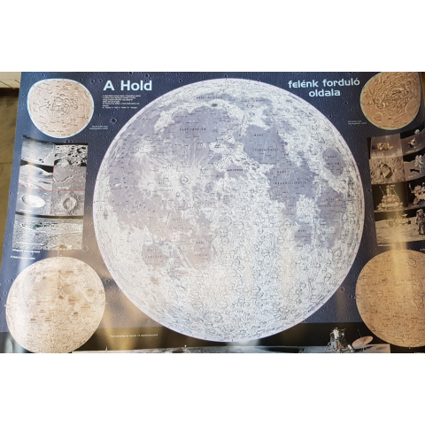 A Holdról készült térkép, A Hold térképe Fali Holdtérkép magyar nyelvű feliratokkal 68x98 cm, kétoldalas. Kétoldalas változatok, melyek egyik oldalán található egy nagy, 60 cm-es térkép a Hold tőlünk látható feléről, majd egy-egy 14 cm-es térkép a pol