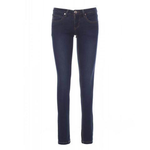 Egyenes szabású, rugalmas anyagú női farmernadrág 4db zsebbel, övvezetőkkel, erősített, tartós varrással. Rugalmas anyagú női farmernadrágSlicce fém cipzáras és gombosDerekán övvezetők találhatóakVarratai erősítettek és kontrasztos színűekA lábszár bel
