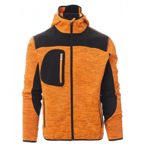 Kombinált anyagösszetételű, formázott kapucnival rendelkező végigcipzáras pulóver kötött poliészter és softshell anyag kombinációjával. Stílusos, divatos kéttónusú megjelenésű pulóver. Kéttónusú kapucnis pulóver softshell betétekkelA pulóver kombinált