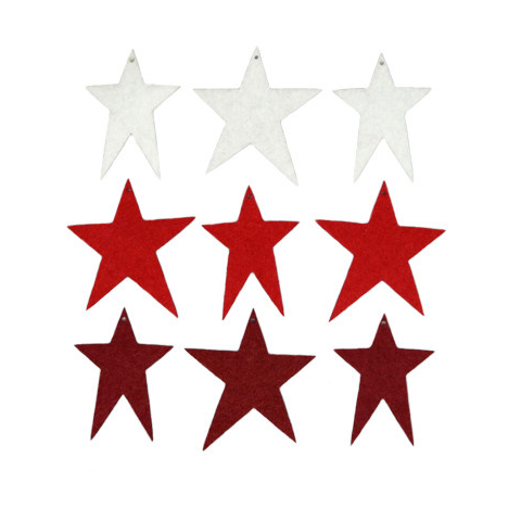 Filcből készült csillagok karácsonyi dekorációkhoz, asztaldísznek. Varrható, ragasztható figurák. A csomagban 9db csillag található, 3 féle színben.