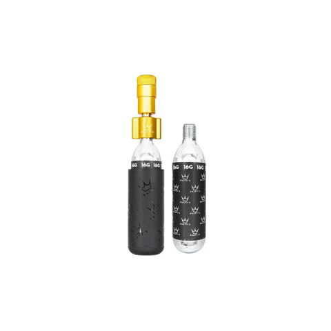 Két 16g-os CO2 patronnal ellátott készlet a külső gumi vészhelyzeti felfújásához. A szabadalmaztatott kialakítású szelepfej CNC megmunkált 6061-es alumíniumötvözetből készült. Összesen 12 színválasztékban kapható 16 vagy 25 g-os patronokkal és felhúzható szilikon védőburkolattal.