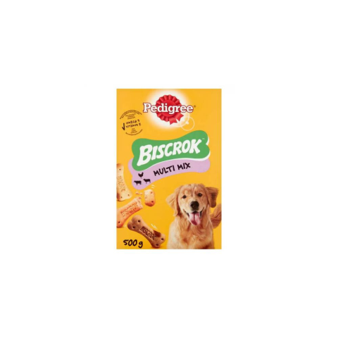 Pedigree Biscrok Multi-Mix - jutalomfalat (keksz) kutyák részére (500g) - csirke, marha és bárány ízesítésűAz Omega 3 zsírsavak egész életükre fitten tartják- E-vitaminnal, ami segít fenntartani a természetes védekezőképességet- Ásványi anyagok, beleértve a kalciumot, ami a csontokat erősíti- Nem tartalmaz mesterséges ízesítőt