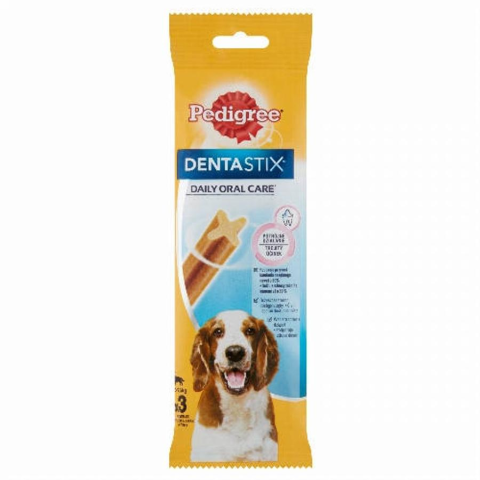 Pedigree DentaStix 10-25kg - jutalomfalat (fogtisztító) Közepes testű kutyák részére (3db/77g)Hármas hatás:- Csökkenti a fogkőképződést, akár 80%-kal- Tisztítja a nehezen elérhető fogakat- Hozzájárul a fogíny egészségéhezFelbontás után 14 napon belül felhasználandó.