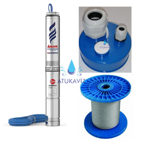 Pedrollo 4Block 4/14 búvárszivattyú + 40 méter A4 4 mm drótkötél + kútsapka Szivattyú: kW: 1,1 HP 1,5 Tápfeszültség: 220-230V / 50Hz 8A Védelem: IPX8 Maximális homoktűrő-képesség: 150g/m³ Szigetelési osztály: F Megfelelő üzemi hőmérséklet: max 35° C K