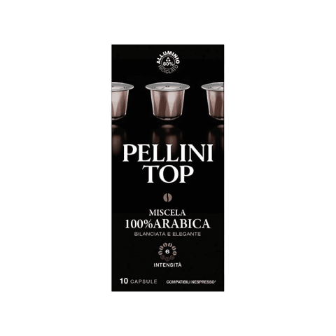 Pellini TOP kiváló minőségű őrölt kávé Alumínium kapszulában (10db 5,5g-os egyadagos kávékapszula védőgázas csomagolásban. Nettó tömeg: 1 karton = 55g ) Elegáns és választékos aromájú 100% Arabica őrölt kávé virágos, csokoládés és pirított magvas jegyekkel. Kifinomult testesség intenzív ízvilággal párosulva. A Pellini törekszik arra, hogy mindig hibátlan ízű és állandó minőségű kávé kerüljön a csomagolásba. * A kapszula kompatibilis a Nespres