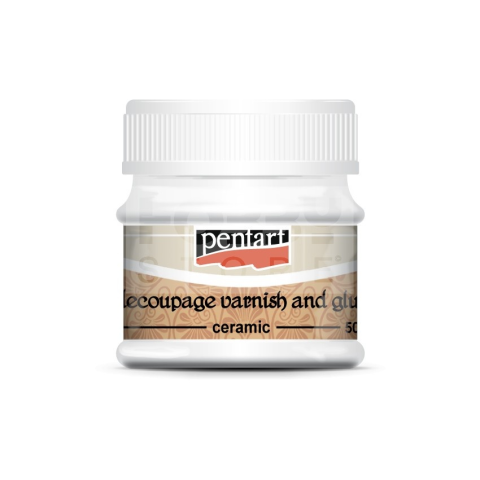 Pentart Dekupázs ragasztólakk kerámiára 50 ml A Pentart Dekupázs ragasztólakk kerámiára egy vízbázisú, multifunkciós termék, amely egyszerre működik ragasztóként és fedőlakként. Kifejezetten olyan felületekre tervezték, mint az üveg vagy mázas kerámia, t