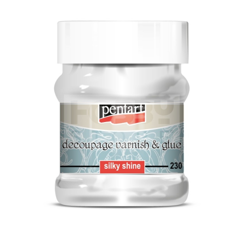 Pentart Dekupázs ragasztólakk selyemfényű 230 ml A Pentart Dekupázs ragasztólakk selyemfényű 230 ml egy vízbázisú, kettős funkciójú termék, amely egyszerre lép fel ragasztóként és fedőlakként. A selyemfényes bevonat elegáns és természetes megjelenést köl