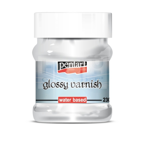 Pentart Fényes lakk vízbázisú 230 ml A Pentart Fényes Lakk egy vízbázisú, magasfényű fedőlakk, amely felvitel után gyorsan szárad és vízálló, fényes felületet hoz létre. Ideális befejező rétegként különböző kreatív felületeken, legyen szó fa-, fém-, kerá
