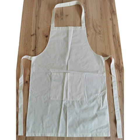Jellemzői: Szín: natúr Anyaga: vászon méretek: hosszúság: 82,5 cm, szélesség: 55 cm közepén zsebbel ellátott nyakon akasztós pánttal, deréktájon köthető pánttal ajánljuk konyhai munkavégzésekhez, kreatív foglalkozások, dekorációk készítéskor a ruházatu