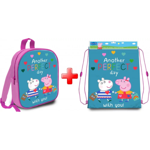 Peppa malac ovis táska és tornazsák szett Táska mérete: 29 cm Anyaga: PVC + poliészter Tornazsák mérete: 40x30 cm Anyaga: 100% poliészter