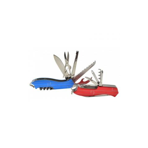 Multifunkcionális zsebkés Blue Praktikus kés háztartásba, utazáshoz, túrásázhoz, sütögetéshez, stb... Fel van szerelve pár funkcióval kés, reszelő fához, halpucoló, olló, üveg- és konzervnyitó, ár, csavarhúzó. A kés kampóval van felszerelve, kulcstartóra vagy nadrágra erősíthető.Technikai paraméterek:Hossz: 9,2 cmSzélesség: 2,5 cmSúly: 115 g