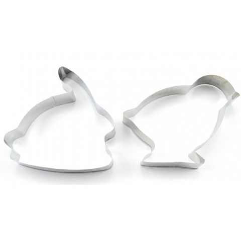 2db-os sütemény kiszúró készletA készlet 2db sütemény kiszúrót tartalmaz nyúl és csibe motívumokkal. Az ónozott fémlemezből készült formák szárazsütemények kivágásához használatosak.Technikai paraméterek:Darabszám: 2 db Csibe méretei (ho x szé x ma): 11 x 9 x 2 cmNyúl méretei (ho x szé x ma): 10 x 10 x 2 cmSúly: 65 g