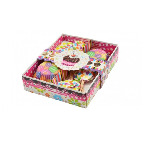 48-részes muffinkosár készlet A készlet papírkosarakat és zászlókat tartalmaz lufi, kutya, muffin és pont motívummal, dobozban elhelyezve, akár ajándéknak is tökéletes. A papírkosárkákat muffin, cupcakes, golyók, stb... készítésénél haználatos. A zászlók dekorációként szolgálnak a kész édességeken.Technikai paraméterek:Kosárkák átmérői: 5 cmZászló hossza: 7,5 cmSúly: 83 gCsomagolás tartalma: 24 x papírkosár24 x zászló