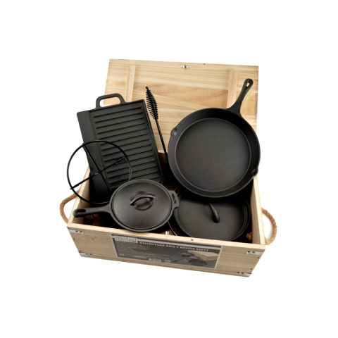 Öntöttvas BBQ Grill Szett: Tökéletes kültéri főzéshez 🔥 Ez a 6+1 részes öntöttvas grill szett minden szükséges eszközt tartalmaz a szabadtéri főzéshez. A masszív öntöttvas edények egyedi megjelenést kölcsönöznek a grillezésnek, és kiváló hőelosztást...
